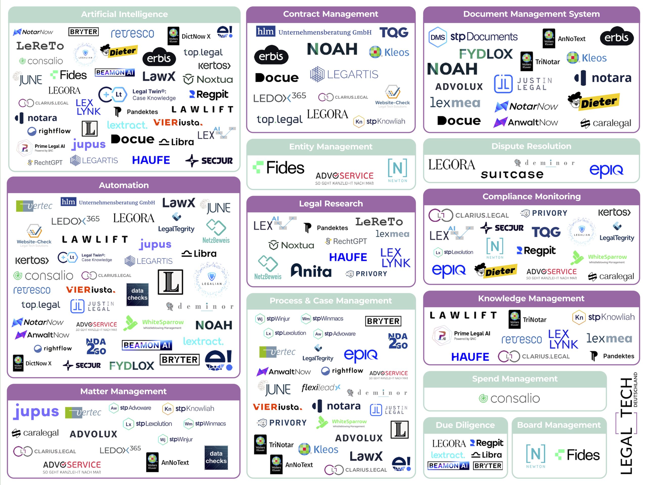 Die deutsche Legal Tech-Landschaft auf einen Blick: Entdecke die wichtigsten Tools und Lösungen – übersichtlich sortiert nach Kategorien.